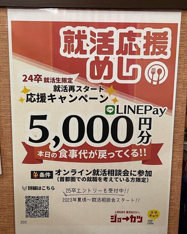 5月から、就活応援めしが、パワーアップ!なんと五千円キャッシュバック❣️四年生だけでなく三年生もエントリーOK。