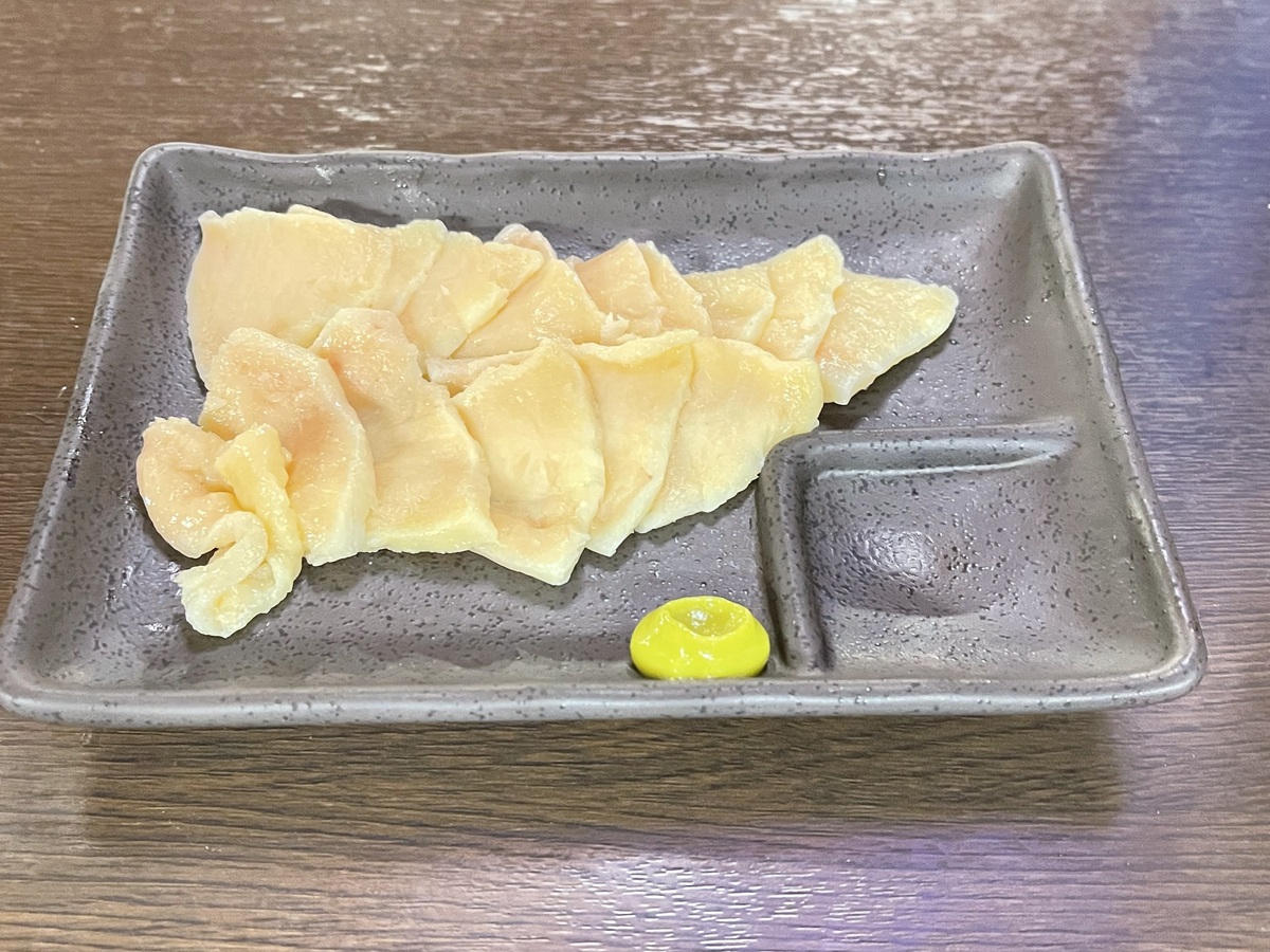 コリコリとした食感と脂の甘みが特徴で、お酒との相性も抜群。立ち飲みスタイルで気軽に楽しめる一品です。