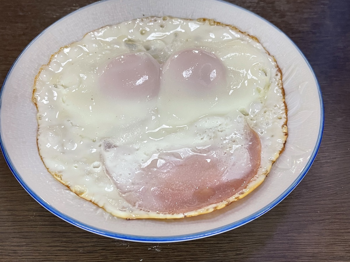 立ち飲み居酒屋ドラム缶西千葉店のハムエッグは、半熟の目玉焼きとハムを香ばしく焼き上げた人気のおつまみです。黄身を崩してハムに絡めると、お酒との相性も抜群です。